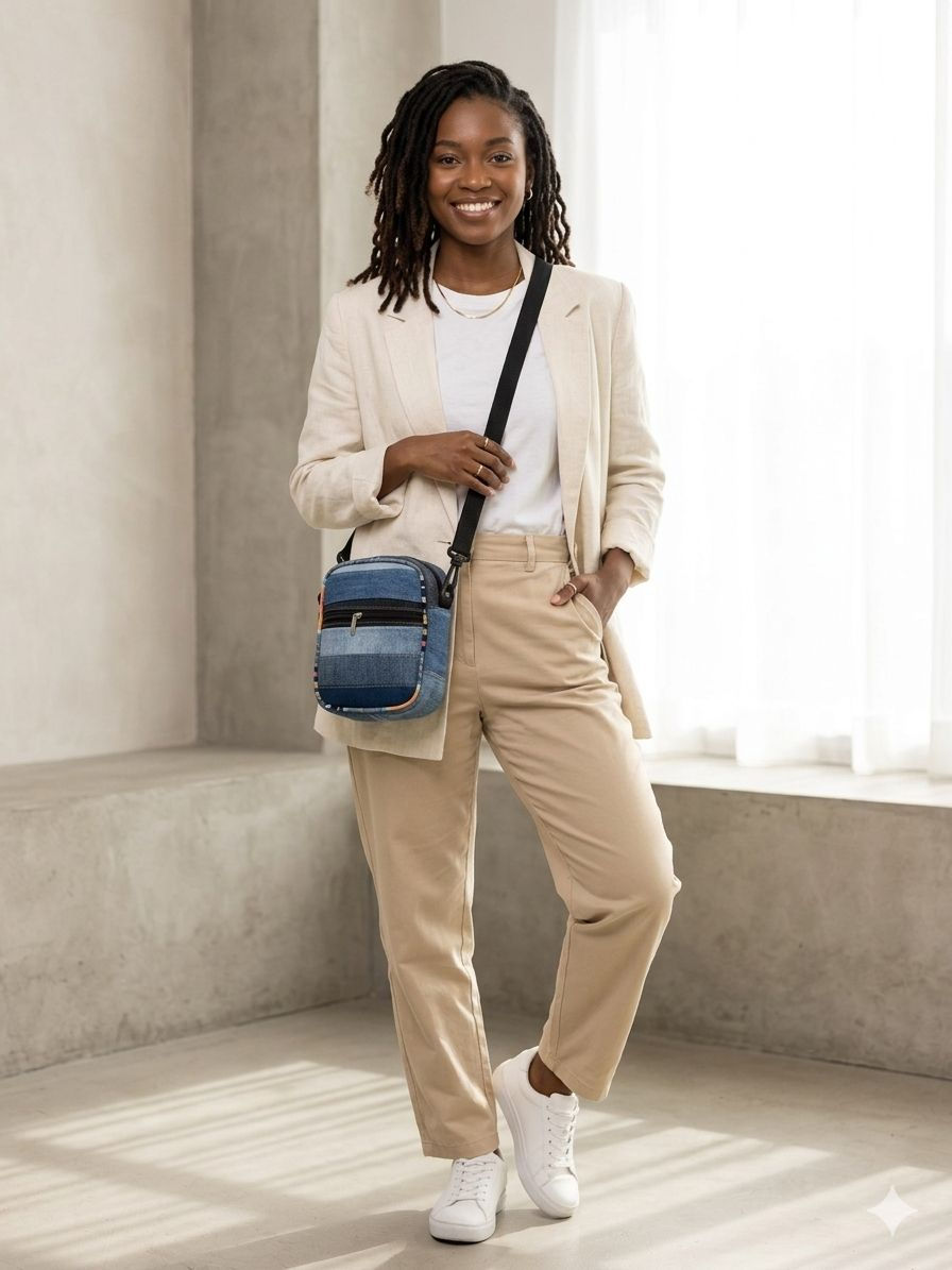 As peças são feitas com tecido produzido a partir de garrafas PET recicladas, que passam por um processo de transformação até se tornarem fio e, depois, tecido. É assim que o que antes era descarte volta ao mundo em uma nova forma.